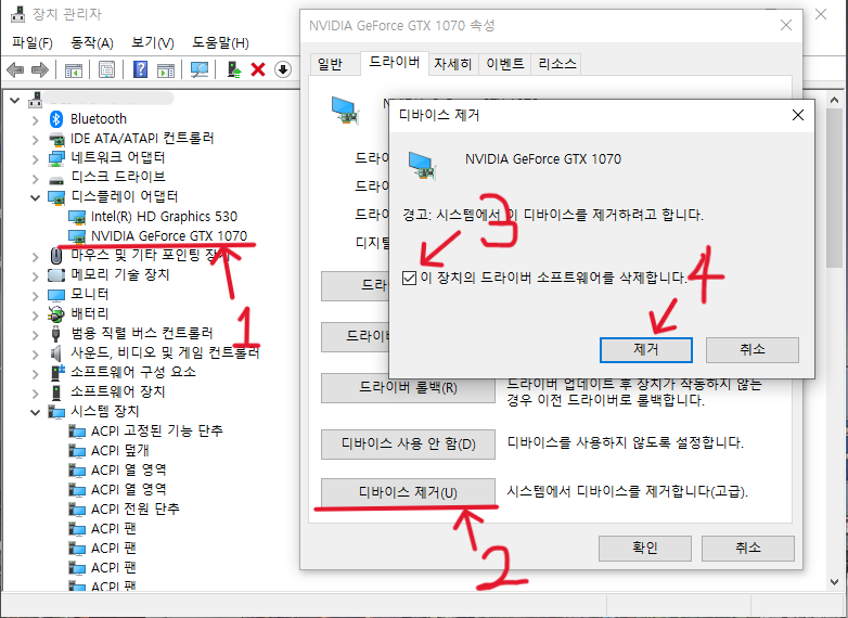 앞에서 설명했던 디바이스 제거 - 드라이버 소프트웨어 삭제를 재시도 해줍니다.
